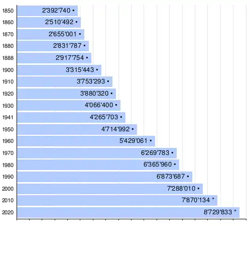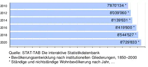In der Schweiz leben 8'962'258 Menschen (31. Dezember 2023) auf 41'291 Quadratkilometern. Der Staat gehört mit 217 Einwohnern pro Quadratkilometer zu den dichter besiedelten Staaten Europas, wobei sich die Bevölkerung im Mittelland, der Beckenzone zwischen Jura und Alpen, sowie im südlichen Tessin konzentriert. Die acht grössten Städte bzw. Wirtschaftszentren sind Zürich, Genf, Basel, Lausanne, Bern, Winterthur, Luzern und St. Gallen.