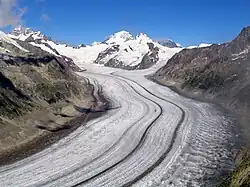 Das Schweizer Hochgebirge wird massgeblich durch die vielen Gletscher geprägt. Der grösste und längste Alpen-Gletscher ist der Grosse Aletschgletscher, danach folgt der Gornergletscher (nach Fläche).[23] Den letzten Höchststand erreichten die Schweizer Gletscher während der Kleinen Eiszeit, die von Anfang des 15. bis Mitte des 19. Jahrhunderts dauerte. Seit Mitte des 19. Jahrhunderts ist auch in der Schweiz, wie nahezu weltweit, ein deutlicher Rückgang der Gletscher zu beobachten.[24] Dieser Gletscherschwund hat sich in den letzten Jahrzehnten noch verstärkt.[25] Zwischen 1973 und 2010 nahm die Fläche aller Gletscher der Schweizer Alpen um 28 Prozent auf ca. 940 Quadratkilometer ab.[26] Im Hitzesommer 2015 verloren die Gletscher im Vergleich zu den Vorjahren ein Vielfaches an Masse.[27] Noch extremer wurde der Gletscherschwund in den Jahren 2022 und 2023, als die Masse der Gletscher in nur zwei Jahren um rund 10 Prozent zurückging.[28]