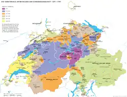 | Unabhängigkeit | 1499 faktische Ablösung vom Heiligen Römischen Reich im Frieden zu Basel, 1648 juristische Trennung vom Heiligen Römischen Reich im Westfälischen Frieden, 1798–1813 französischer Vasallenstaat zur Zeit von Helvetik und Mediation | ||||
