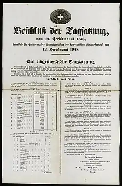 Am 12. September 1848 erklärte die Tagsatzung, dass die Verfassung «damit angenommen [sei] und als Grundgesetz der Eidgenossenschaft» gelte. Zwei Tage später kam ihr Aufruf zur Durchführung der ersten Nationalrats- und Ständeratswahlen, wobei die Konstituierung des neuen Parlaments bereits für den 6. November 1848 in Bern vorgesehen war. Der alte Bundesvertrag blieb gemäss Artikel 7 der Übergangsbestimmungen noch während dieser Wochen neben der neuen Verfassung in Kraft, bis zur Wahl der ersten sieben Bundesräte durch die erste Bundesversammlung am 16. November 1848.[5]