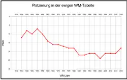 | 41 WM-Spiele 14 Siege 8[1] Unentschieden 19 Niederlagen 55:73 Tore | |