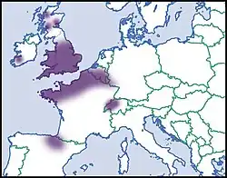 Das Verbreitungsgebiet erstreckt sich von den Niederlanden[6] im Norden bis nach Nordspanien im Süden, im Westen von Nordostfrankreich, über die Schweiz, Süddeutschland bis nach Österreich. Vermutlich wurde die Art vor etlichen hundert Jahren auf die Britischen Inseln verschleppt, wo sie sich derzeit sowohl in England wie auch Irland weiter ausdehnt. Auch in Schottland gibt es einige Vorkommen. 2002 wurde sie in Norwegen gefunden, wohl ebenfalls anthropogen verschleppt.[7] Auf Malta dürfte sie ebenfalls ein Neozoon sein.[8] In Deutschland ist die Art bisher nur in Rheinland-Pfalz sicher nachgewiesen.[9] Ältere Nachweise in der Oberrheingegend ließen sich in neuerer Zeit nicht mehr bestätigen.