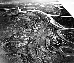Während das höher gelegene Gelände der Quellregionen von Fließgewässern durch Verwitterung und Erosion allmählich tiefergelegt wird, gelangt das dort abgeführte Material mit dem abfließenden Wasser über kleinere Gerinne als Sedimentfracht in die Niederungen, wo sich die Gerinne zu einem größeren Fluss vereinen, der schließlich entweder in einen noch größeren Fluss oder ins Meer mündet. Da im tiefer gelegenen Gelände das Gefälle und der Höhenunterschied zur Erosionsbasis gering sind, ist dort einerseits auch die Fließgeschwindigkeit des Wassers geringer als im Hochland und andererseits erfolgt, im Gegensatz zum Hochland, faktisch keine Tiefenerosion mehr, sondern nur noch Seitenerosion. Daher lagert ein Fluss in der Niederung einen großen Teil der Sandpartikel seiner Sedimentfracht im Gerinnebett ab und um (englisch Channel Deposits ‚Gerinneablagerungen‘), wobei er in der Regel nicht geradlinig fließt, sondern Mäander ausbildet. Bei Hochwasser tritt der Fluss über die Ufer und große Teile der Ebene können für wenige Tage oder Wochen einen eher stillgewässerartigen Charakter annehmen. Dann werden auch die feinkörnigsten Fraktionen der Sedimentfracht (Silt und Ton) z. T. weit außerhalb des eigentlichen Gerinnebettes abgelagert (engl. Overbank Deposits ‚Über-die-Ufer-Ablagerungen‘). Bei derartigen Ereignissen wird der Hauptteil der Sedimentfracht im Bereich der Ufer abgelagert, sodass dort natürliche Flussdeiche (engl. Levees) aufgeschüttet werden. So kann ein Fluss seinen Pegel über das Höhenniveau der umliegenden Schwemmflächen heben, was auch zu einer allmählichen Aufschüttung des eigentlichen Gerinnebettes über dessen ursprüngliches Niveau führt. Bricht bei Hochwasser ein solcher Deich, bilden sich an den Bruchstellen typische Sedimentfächer, die als Crevasse Splays bezeichnet und den Overbank Deposits zugerechnet werden. Da Wasser stets bestrebt ist, dem stärksten Gefälle zu folgen, können solche Deichbrüche dazu führen, dass der Fluss nach dem Hochwasser an dieser Stelle nicht mehr in sein altes Bett zurückkehrt, sondern einen etwas anderen Weg einschlägt. Die dann höher liegenden Flächen des alten Gerinnebettes, die meist an das neu gebildete Gerinne angrenzen, werden im Lauf der Zeit durch die Seitenerosion (Prallhangerosion) des Flusses oder auch, falls sich keine stabilisierende Vegetation auf diesen Flächen etablieren kann, durch Starkregen und Wind zumindest teilweise wieder abgetragen. Das Zusammenspiel aus teils großflächiger Ablagerung und Seitenerosion formt über relativ kurze geologische Zeiträume die meist extrem reliefarme Schwemmebene.