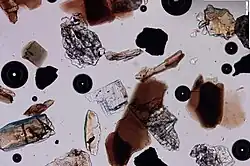 In der traditionellen Schwermineral-Analyse wird die im Labor angereicherte Schwermineralfraktion auf einen mit einem Einbettungsmedium wie Kanadabalsam bedeckten Objektträger aufgebracht und anschließend unter dem Polarisationsmikroskop untersucht.[7] Die Mineralkörner werden dabei, ähnlich wie bei einer Dünnschliffanalyse, anhand ihrer optischen Eigenschaften wie Doppelbrechung, Pleochroismus und Auslöschung sowie anderer Merkmale wie Form und Farbe identifiziert.[7][5] In den letzten Jahren hat zudem die Anwendung alternativer Techniken wie der Ramanspektroskopie oder Röntgenspektroskopie zugenommen.[8]