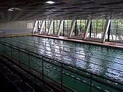 Das große, ursprünglich geflieste Schwimmerbecken ist 50 Meter lang und hat acht Bahnen mit Startblöcken auf beiden Seiten. Unter dem Tribünenbereich befinden sich Aufenthalts- und Materialräume für den Schwimmmeister und die in der Schwimmhalle eingemieteten Vereine. Auf der anderen Seite sowie an den Kopfseiten des Beckens sind Wärmebänke aus Beton aufgestellt. An der Westseite der Halle befindet sich ein kanzelähnlicher Raum für Kampfrichter.