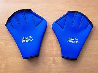 Schwimmhandschuhe sind eine Schwimmhilfe zum Erlernen von Schwimmtechniken. Diese Handschuhe aus flexiblem Stoff dienen dazu, den Wasserwiderstand der Hände beim Wassersport zu erhöhen. Insbesondere Kraul- und Schmetterlingschwimmer mit kleinen Händen profitieren davon. Schwimmhandschuhe sind gut geeignet, um die Schulterpartien beim Kraulen noch besser zu trainieren. Weil sie den Wasserwiderstand erhöhen, eignen sie sich auch zum Armtraining beim Aquajogging, der Wassergymnastik und anderen Wassersportarten.