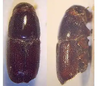 Die Käfer werden 2,5 Millimeter lang und haben einen braunschwarz gefärbten, walzenförmigen Körper. Der Halsschild ist groß, vorne verengt, die Basis und die Seiten sind kantig gerandet. Es verdeckt von oben gesehen nicht den Kopf. Die Stirn ist beim männlichen Käfer flach und wollig behaart, beim weiblichen Käfer dagegen gewölbt und kahl (Sexualdimorphismus). Das Abdomen steigt ab dem zweiten Sternit zum Ende hin schräg an. An diesem befindet sich ein kleiner, nach hinten gerichteter Dornfortsatz. Die Schienen (Tibien) der Vorderbeine sind außen glatt, die Spitze ist hakenförmig gekrümmt. Das dritte Tarsenglied ist zweilappig. Die rotbraun gefärbten Flügeldecken tragen regelmäßige Punktreihen aus kleinen Vertiefungen.