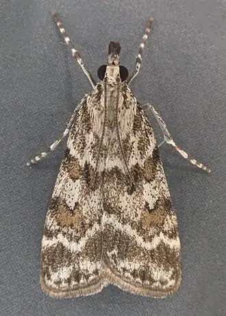 Die Flügelspannweite der Falter beträgt zwischen 17 und 22 mm.[1] Die Vorderflügel weisen ein charakteristisches Muster aus blassbraunen Flecken auf. Die Hinterflügel sind überwiegend weißlich. Lediglich die Submarginalregion ist blassbraun.
