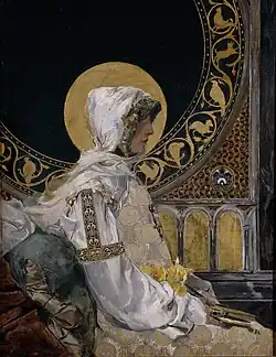 Das Bildnis einer Heiligen im Gebet – spanisch Santa en oración oder Santa Clotilde (78 × 61 cm) –, das Sorolla 1888 in Italien anfertigte und das die Heilige Clothilde zeigt, hatte für das Paar eine tiefere Bedeutung. Das Gemälde erscheint an prominenter Stelle auf zahlreichen Fotografien des Ateliers des Malers und wurde mehrfach, wie beim Gemälde Señora de Sorolla, aber auch auf anderen Porträtbildern, als Hintergrunddekoration verwendet. Auf dem Bild sieht man ebenfalls gelbe Rosen. Es wurde 1993 vom Prado erworben.[6]