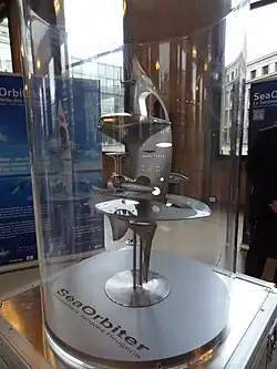 Der Sea Orbiter soll hingegen still mit der Strömung treiben, jedoch sollen zwei Elektromotoren mit Geschwindigkeiten bis zu vier Knoten kleinere Kurskorrekturen ermöglichen. In dem Dokumentarfilm „Terra X - Universum der Ozeane“ mit Frank Schätzing wird der Sea Orbiter mit einem riesigen Seepferd verglichen.[1] Von der Gesamthöhe der Forschungsstation sollen ca. ein Drittel über Wasser zu sehen sein. 30 Meter werden sich unter der Wasseroberfläche befinden und mit Sichtfenstern ausgestattet sein. Der Orbiter besteht aus fast 10 Decks, auf denen sich 18 Personen aufhalten sollen. In Teilen der Station wird der Luftdruck dem Unterwasserdruck angepasst. Der Hochdruckbereich soll acht der 18 Gesamtmitglieder der Besatzung Platz bieten. Auch Astronauten sollen dann zu den Wissenschaftlern an Bord gehören, da der Sea Orbiter als Trainingsstation für Weltraumbesucher dienen kann.