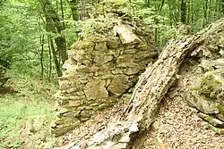 - Reste der Burg Lamberk (Langenberg) auf einem Felssporn über einer Flussschleife links der Oslava, östlich des Dorfes