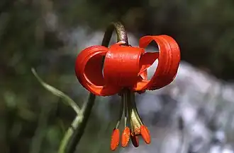 Die Pflanze blüht im Juni und Juli in einer Rispe mit ein bis fünf Blüten (in Kultur bis zu 15). Die Blüten bestehen aus sechs nach hinten gebogenen Blütenblättern (türkenbundartig). Es sind drei Kron- und drei Kelchblätter, die sich aber sehr ähnlich sehen. Die Farbe der Blüten variiert von orangerot bis scharlachrot mit schwarzen Punkten. Die Antheren sind braun, die Pollen zinnoberrot. Die Blüte duftet stark und unangenehm.