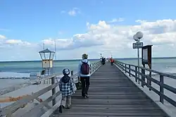 Grömitz, ein anerkanntes Seeheilbad, errichtete für seine Gäste an der Promenade zusammen mit dem Vorplatz 1984 eine neue Seebrücke. Sie erstreckt sich 398 Meter auf die Ostsee hinaus.[2]
