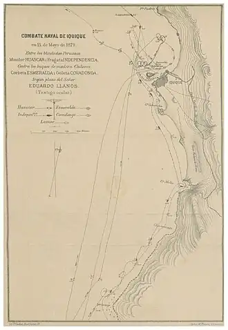 Am Morgen des 21. Mai 1879 näherten sich die peruanischen Schiffe dem Hafen von Iquique. Während die La Mar die Flagge der USA hisste und floh, begaben sich die Esmeralda und die Covadonga zunächst in unmittelbare Nähe des Hafens und eröffneten das Feuer auf die herannahende Huáscar. Eine halbe Stunde später traf auch die Independencia vor Iquique ein. Da die Peruaner aufgrund des Seegangs in der Hafeneinfahrt nicht zuverlässig zielen konnten und Admiral Miguel Grau nicht das Risiko eingehen wollte, durch versehentlichen Beschuss des Ufers Peruaner zu gefährden, war es ihm allerdings kaum möglich, das Feuer zu erwidern.