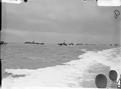 Um 9:00 Uhr des 5. Juni stach die alliierte Armada – ausgenommen die Forces U und O – in See. Die Gruppen U und O starteten erst um 16:00 Uhr desselben Tages. Die Fahrt und die Räumung der Minen verliefen planmäßig; nur ein amerikanischer Minensucher sank. Die ersten alliierten Schiffe, die vor der Normandieküste auf die zugewiesenen Positionen (vgl. nebenstehende Karte des Schiffsbeschusses auf die Küste) vor Anker[6] gingen, waren die USS Bayfield um 2:29 Uhr 21 Kilometer vor dem Utah Beach mit General J. Lawton Collins an Bord und die USS Ancon um 2:51 Uhr 20 Kilometer vor dem Omaha Beach. Nach und nach erreichten auch die anderen 5.300 Schiffe der Invasionsflotte ihre Positionen, wobei die Schlachtschiffe etwa 9.900 Meter und die Zerstörer etwa 4.500 Meter vor der Küste ankern sollten. Viele der an Bord befindlichen Soldaten litten nach stundenlanger Überfahrt in schwerer See unter Seekrankheit. Um 4:15 Uhr begannen die Landungstruppen, in die Landungsboote umzusteigen.