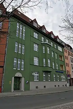 Die Fassade ist verputzt. In der südlichen Achse ist ein von Halbsäulen flankiertes Portal mit darüber angeordneten, hohen Treppenhausfenstern eingefügt. In der nördlichen Achse prägen breitere Fenster bzw. – im ersten und zweiten Obergeschoss – Loggien die Fassade. Ein zweigeschossiger Erker ist in den Mittelachsen ausgeführt.