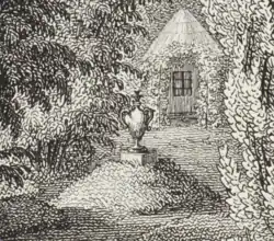 - Ein Vogelhaus in der Gestalt eines Pavillons stand gegenüber einer „Nische von lebendigem Grün“, umgeben von „Terrassen von Rasen“, Obstbäumen, Blumen und Sträuchern.