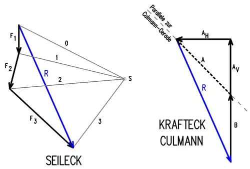 Im Beispiel ist ein Balken auf zwei Stützen A und B gegeben, an dem die Kräfte F1, F2 und F3 entsprechend der Skizze angreifen. Zunächst werden die Kräfte entsprechend der unteren Skizze maßstäblich als Kräftepfeile gezeichnet und geometrisch addiert. Dabei werden die Kräfte F1, F2 und F3 auf ihren Wirkungslinien fortlaufend aneinandergereiht so dargestellt, dass auf eine Pfeilspitze der Pfeilanfang der nächsten Kraft folgt. Verbindet man den Pfeilbeginn von Kraft F1 mit der Pfeilspitze von Kraft F3, so erhält man die resultierende Kraft R nach Größe und Richtung. Danach zieht man von einem beliebig gewählten Punkt, dem Pol S sogenannte Polstrahlen (Verbindungslinien) zu den Enden der einzelnen Kräftepfeile und nummeriert sie fortlaufend. Die so entstandenen Dreiecke stellen Kraftecke dar, deren Polstrahlen sich mit den zugehörigen Kräften in den Punkten I,II, III und P der oberen Skizze schneiden.