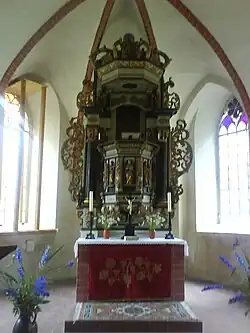 Der Portikusaltar in der Kirche ist aus dem Jahr 1718, daran sind Schnitzfiguren aus dem 15. Jahrhundert befestigt.