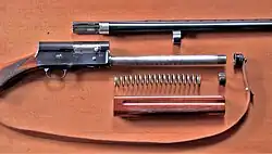 Auch John Moses Browning verwendete für erste Versuche einen Winchester-Karabiner mit Kniegelenkverschluss. Zum Nachladen nutzte er die Energie der an der Mündung ausströmenden Gase, die auf eine gelochte Metallplatte am Laufende aufprallten. Die Bewegung der Platte wurde über einen Hebelmechanismus auf den Ladehebel der Waffe übertragen. Bei späteren Entwicklungen setzte er einen parallel zum Lauf angebrachten Zylinder ein, in dem ein Gaskolben durch aus dem Lauf in den Zylinder übergeleitetes Gas nach hinten gedrückt wurde: im Prinzip ein Gasdrucklader.