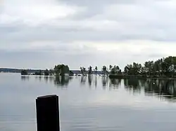 | Blick vom Aussichtsturm auf den See und die Insel | ||