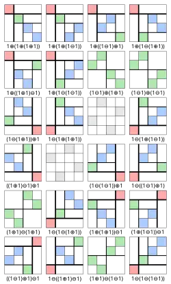 | Klammerschreibweise | 1 2 3 | 1 [2 3] | [1 2] 3 | [1 [2 3]] | [[1 2] 3] | [1 2 3] |
