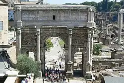 Der Triumphbogen steht am nordwestlichen Ende des Forum Romanum. Durch den mittleren Bogen führt die Via Sacra in Richtung Kapitol. Da der Bogen im Mittelalter in Festungsbauten einbezogen wurde, befindet er sich noch heute in einem guten Zustand. Wie auf dem Gemälde von Canaletto zu sehen ist, war der Bogen noch zu Goethes Zeiten zum Teil im Erdreich verschwunden.