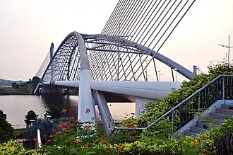 | Konstruktion | Kombinierte Bogen- und Schrägseilbrücke | |
