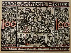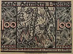 Im Jahre 1922 druckte die Stadt Sternberg, so wie viele andere deutsche Städte in der Weimarer Republik auch, eine Serie eigener Notgeldscheine. Die Vorderseite zeigt einheitlich eine Stadtansicht von 1492. Für die Rückseiten wählte man Darstellungen aus der Legende vom Sternberger Hostienfrevel. Die Ausgabe der Sternberger Notgeldscheine erfolgte kommentarlos „als handele es sich dabei um eine historische, wahrheitsgemäße Begebenheit.“[2]
