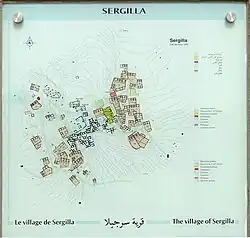 Im Zentrum des Ortes, dessen Geschichte in der Mitte des 4. Jahrhunderts beginnt und nach dem 7. Jahrhundert endet, liegen die beiden am besten erhaltenen Gebäude nebeneinander. Sie stammen aus dem 5. Jahrhundert und bilden einen öffentlichen Gebäudekomplex. In der Bauform entsprechen sie den großen privaten Villen, also zweigeschossigen, aus Kalksteinquadern massiv und fugenlos geschichteten Giebelhäusern. Es gibt die allgemeine Unterscheidung, dass Privathäuser sich normalerweise zu einem, von einer hohen Mauer umgebenen Innenhof öffnen, während sich die Eingänge öffentlicher Gebäude zur Straße orientieren.