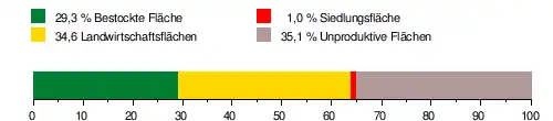 Es besteht zu 29,3 % aus bestockter Fläche, zu 34,6 % aus Landwirtschaftsflächen, zu 1,0 % aus Siedlungsflächen und zu 35,1 % aus unproduktiven Flächen.[4]