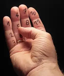 Im gewohnten Dezimalsystem (Zehner-System) zählt man mit den zehn Fingern (2 × 5) beider Hände. In einigen Gegenden der Welt existierte aber ein Zählen mit Hilfe der Fingerglieder, das einhändig zur Zahl zwölf (duodezimal), zweihändig aber zur Zahl 60 führte.[9] Trotzdem ist hier zu beachten, dass das zweihändige Zählen mit Fingergliedern nach dem Prinzip 5 × 12 funktioniert und nicht wie das Sexagesimale Zahlensystem nach dem Prinzip 6 × 10.