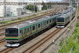 ![]() Bahnhöfen Totsuka und Ofuna (Juni 2017) Züge der Baureihe E231 zwischen den Bahnhöfen Totsuka und Ofuna (Juni 2017) | |