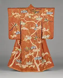 Erste Hälfte des 19. Jahrhunderts: Zeremonielle Knoten (Noshi), Pflaumenbäume und Schmetterlingsmuster. Shibori und Stickerei auf weißem Seidendamast -