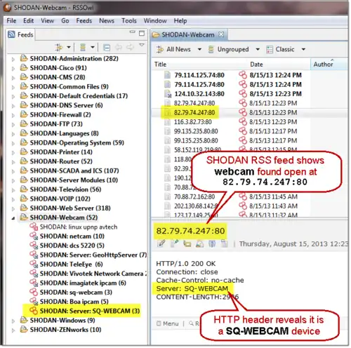 Diese freien Benachrichtigungen über RSS können dazu verwendet werden, eine ständige Überwachung von SHODAN-Ergebnissen für alle neuen Sicherheitsrisiken im Zusammenhang mit Organisationen durchzuführen. Sie sind Teil der freien defensiven Tool-Suite des Google-Hacking-Diggity-Projekts,[19] die eine Art von Intrusion Detection System für Suchmaschinen-Hacking (einschließlich Ergebnissen von SHODAN, Google, Bing usw.) bilden.