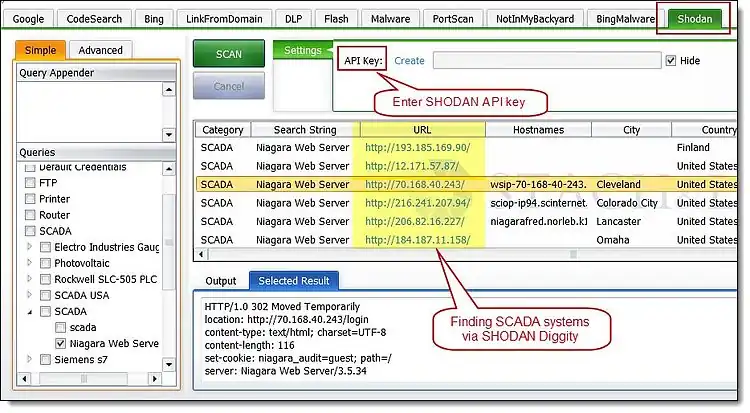 SHODAN Diggity liefert eine komfortable Liste von 167 Suchanfragen in der SHODAN-Hacking-Datenbank (SHDB), einer vorgefertigten Wörterbuchdatei, mit.[17] Sie unterstützt verschiedene Technologien wie Webcams, Drucker, VoIP-Geräte, Router, Toaster, Switches und sogar SCADA/Industrieanlagensteuerungen (ICS), um nur einige zu nennen.