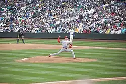 Ohtani ist 1,93 Meter groß und 92 Kilogramm schwer.[76] Er wirft mit der rechten Hand und wird hauptsächlich als Starting Pitcher eingesetzt, spielt also in der Regel ab dem ersten Inning. Er wirft mit einer Überhand-Technik, mit der er folgende Durchschnitts- und Höchstgeschwindigkeiten erzielt: