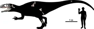 Rekonstruiertes Bild des Siamraptor suwati, gefundene Fossilien sind markiert. Vergleich mit Menschen (1,8 Meter groß). | ||||||||||