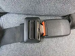 Der Dreipunktgurt besteht aus dem Gurtschloss, der Schlosszunge und dem Gurt und Aufrollmechanismus; dazu kommen der Umlenker und der Endbeschlag. Zum Anlegen des Sicherheitsgurtes, auch Anschnallen genannt, wird das hierfür vorgesehene Endstück (Schlosszunge) des Gurtes in ein Gurtschloss eingeführt und rastet dort ein. Der Gurt besteht aus etwa 300 Fäden, die, miteinander verwoben, ein 46 bis 48 Millimeter breites und 1,2 Millimeter starkes Band ergeben. Die einzelnen Fäden wiederum sind aus etwa 100 Polyesterfasern gesponnen, die etwa doppelt so dick sind wie ein menschliches Haar.[33] Der Dreipunktgurt mit einer Gurtbreite von mindestens 46 mm muss, nach der ECE-Regelung Nr. 16, eine Last von 980 daN aufnehmen können[34] und eine Reißlast von mindestens 1470 daN haben.[35] Das Gurtband kann sich um 6 bis 11 Prozent dehnen. Hinzu kommt die sogenannte Gurtlose; sie ergibt sich aus dem prinzipbedingten Leerweg (bis zum Blockieren der Gurtrolle), dem – durch vorgegebenen Tragekomfort – nicht eng am Körper anliegenden Gurt und dem auf der Rolle nur locker aufgerollten Gurtband. Sie kann durch den Gurtstraffer vermindert werden.[36]