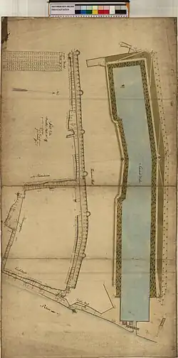Aufgrund von Finanzierungsproblemen und langer Verhandlungen zwischen Stadt, der Handelskammer und den französischen Behörden erfolgte der Baubeginn erst im Mai 1811, nachdem Napoleon am 6. Januar 1811 den Bau des Hafens genehmigt hatte. Die Stadt Köln solle die Baukosten von 750.000 Franc selbst tragen, dürfe dafür aber die Hafenabgabe der Schiffer einbehalten.[8] 1811 wurde zunächst mit dem Aushub des Hafenbeckens begonnen, wofür der bestehende Wallgraben vor der Stadtmauer lediglich vertieft werden musste. Ab April 1812 wurden dann Stützmauerwerk, Hafenmauern und die Hafeneinfahrtsschleuse errichtet und am 10. November 1812 die Grundsteinlegung mit einem großen Bankett, Volksfest und Feuerwerk gefeiert. In seiner Rede erklärte der Präfekt des Département de la Roer Jean Charles François de Ladoucette: „Am 10. November 1812, im achten Jahr der Regierung Napoleons des Großen, Kaiser der Franzosen […] wurde der erste Stein gelegt für dieses Bauwerk, errichtet für die Sicherheit und die Wohlfahrt des Handels auf dem Rhein, mit Unterstützung der kaiserlichen Freigebigkeit, der Gelder der Stadt und der des Kölner Handels.“[9] Zu dieser Zeit stand der französische Russlandfeldzug kurz vor dem Scheitern. Zwar konnte der Hafen im Winter 1813/14 erstmals genutzt werden, jedoch kam der weitere Ausbau durch die Befreiungskriege und den Abzug der Franzosen aus Köln im Januar 1814 zunächst zum Stillstand.