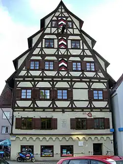Das Haus wurde von der Zunft der Gerber als Gemeinschaftshaus zum Trocknen der Felle errichtet. Dort, wo sich heute Fenster befinden, waren im Mittelalter nur Balken zum Aufhängen der Felle. Nach dem Untergang des Gerberhandwerks wurde das Haus als Gasthaus benutzt. Seit dem Wiederaufbau nach dem Krieg dient das Haus als Apotheke und Stammhaus der Siebendächer Wohnungsbau e. G.