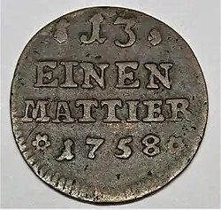 Im Juni griffen auch die Franzosen an. Sie entsandten eine Armee nach Norddeutschland, welche die preußischen Territorien am Rhein besetzte und anschließend gegen Hannover vorging. Für den Zahlungsverkehr mit den französischen Besatzungstruppen ließ Braunschweig-Wolfenbüttel im Folgejahr gesonderte Kupfermünzen prägen.[22] Am 26. Juli 1757 schlugen die französischen Truppen unter Führung des Marschalls d’Estrées die aus Kontingenten der deutschen Kleinstaaten bestehende Observationsarmee unter dem Herzog von Cumberland in der Schlacht bei Hastenbeck. Die Observationsarmee zog sich an die Nordsee zurück, wo sie sich in der Konvention von Kloster Zeven für neutral erklärte. Damit stand im Spätsommer für die Franzosen der Weg nach Berlin offen. Da sie aber kein Interesse daran hatten, Preußen gegenüber Österreich zu sehr zu schwächen, begnügten sie sich mit der Besetzung der mit Preußen verbündeten Fürstentümer. Marschall d’Estrées wurde nach einigen Intrigen in Versailles durch den Herzog von Richelieu ersetzt.