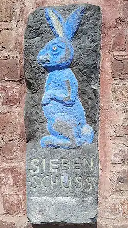 Ursprünglich war der Siebenschussstein ein Grenzstein. Auf diesen Stein malte ein Unbekannter einen fetten Hasen, der Männchen macht, und schuf damit das erste Hasendenkmal. Im Volksmund wurde es bald „Siebenschuss“ genannt.