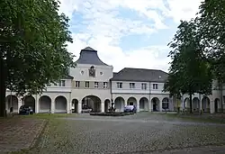 Zentrum der Siedlung ist der Brunnenhof, ein großzügiger Platz mit geschlossenen Gebäudereihen an drei Seiten, in denen sich sowohl Wohnungen als auch Läden befanden. Als zentraler Marktplatz mit Laubengängen, Freifläche mit Baumpflanzungen und einem Brunnen in der Mitte fand hier das gesellschaftliche Leben statt. Die Gebäudereihen sind durch einen Uhrturm in der südlichen Mitte und an den beiden Seitenflügeln durch hängende Übergänge unterbrochen, heute befinden sich hier Durchfahrten.