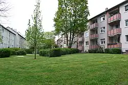 Die städtebauliche Anordnung folgt dem Leitbild einer aufgelockerten Stadt in Zeilenbauweise. Städtebaulich prägend sind die parallelen Baukörper und der rhythmische Versatz der Zeilenglieder. Die drei- bis viergeschossigen Gebäude sind so ausgerichtet, dass sämtliche Wohnungen nach Westen beziehungsweise Osten orientiert sind. Dazwischen liegen großzügig bepflanzte Grünflächen. Ein achtgeschossiges Wohnhochhaus im Osten bildet einen städtebaulichen Akzent.