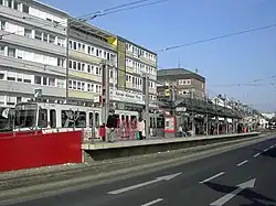 Schließlich wurde die Trasse der Sankt Augustiner Straße 2005 stadtauswärts der Kreuzung mit Stützwänden aufgeweitet, um Platz für einen Hochbahnsteig in Mittellage zu schaffen, der ähnlich dem am Konrad-Adenauer-Platz gestaltet wurde. Gleichzeitig erhielt die Siegburger Bahn ab der Kreuzung Niederkasseler Straße einen eigenen Bahnkörper in Straßenmitte. Die Ausfädelung aus der B 56 wurde zusätzlich durch eine Schranke gesichert.[52][53][54] Mittlerweile trägt die Haltestelle aufgrund des nahegelegenen Hauptsitzes einer Bundesoberbehörde den Namenszusatz Bundeszentralamt für Steuern.