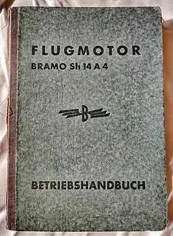 - ↑ FLUGMOTOR BRAMO Sh 14 A4, Betriebshandbuch, 2. Auflage, Brandenburgische Motorenwerke Gesellschaft mit beschränkter Haftung, Berlin-Spandau, BRAMO 1.2000.6.37, Luftfahrt-Archiv Hafner, D-71638 Ludwigsburg, Seite 1