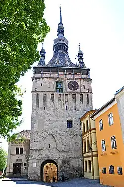 • Der Stundturm (Piața Muzeului 1) ist das Wahrzeichen Sighisoaras. Er wurde in der zweiten Hälfte des 14. Jahrhunderts als Verteidigungsanlage des Haupttors der Burg und als Ratssitz (bis Ende 1656) errichtet. Sein heutiges Aussehen erhielt der Stundturm Ende des 17. Jahrhunderts, als am 30. April 1676 ein verheerender Stadtbrand, von der Unterstadt kommend, auch auf den Turm übergriff. Der Stundturm hat mit Wetterhahn eine Gesamthöhe von etwa 64 Metern. Die Mauerstärke beträgt 2,4 Meter im Erdgeschoss, die Höhe des Mauerwerks beträgt 39,5 Meter (seit 1804), der Turm enthält fünf Stockwerke. Im obersten Stockwerk ist der Turm von einer offenen Holzgalerie umgeben, die auch zur Brandwache und als Ausguck auf das Umfeld der Stadt diente. An Fest- und Feiertagen lassen sich dort die Stadtmusikanten hören. Seit 1898 ist im Stundturm das Museum der Zünfte eingerichtet. Der ursprünglich als Torturm der Stadtbefestigungen konzipierte Turm verbindet die Unter- und Oberstadt. Die verwinkelten Gassen sind ein beliebtes Bildmotiv für Touristen und Maler. Als Zeichen der Blutgerichtsbarkeit, welche die Stadt einst besaß, trägt das Obergeschoss seitlich vier Türmchen, je eines an jedem Turmdacheck. Eine weitere Besonderheit ist das Uhrwerk im vierten Stockwerk, es ist mechanisch mit einem Figurenspiel gekoppelt, das den Stunden- und Tageswechsel begleitet und als einzigartig in Rumänien gilt.[13]