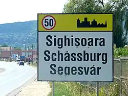 Amtliches dreisprachiges Ortseingangsschild mit der rumänischen, deutschen und ungarischen Stadtbezeichnung