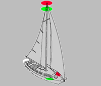 [25a] Segelschiffe unter Segeln führen Seitenlichter und ein Hecklicht, aber kein Topplicht. Segelfahrzeuge, die unter Motor fahren, gelten als Maschinenfahrzeuge und führen entsprechend auch ein Topplicht – dies ist wichtig, da Segelfahrzeuge gegenüber den meisten Maschinenfahrzeugen Vorfahrt haben. [25c] Segelfahrzeuge dürfen zusätzlich an oder nahe der Mastspitze zwei Rundumlichter senkrecht übereinander führen (das obere rot, das untere grün); Anlage I Nr. 2 Buchstabe i KVR regelt: 2m Abstand bei Fahrzeugen über 20 m Länge; 1m Abstand bei Fahrzeugen unter 20 m Länge. Diese beiden zusätzlichen Lichter dürfen jedoch nicht zusammen mit der Dreifarbenlaterne geführt werden. |